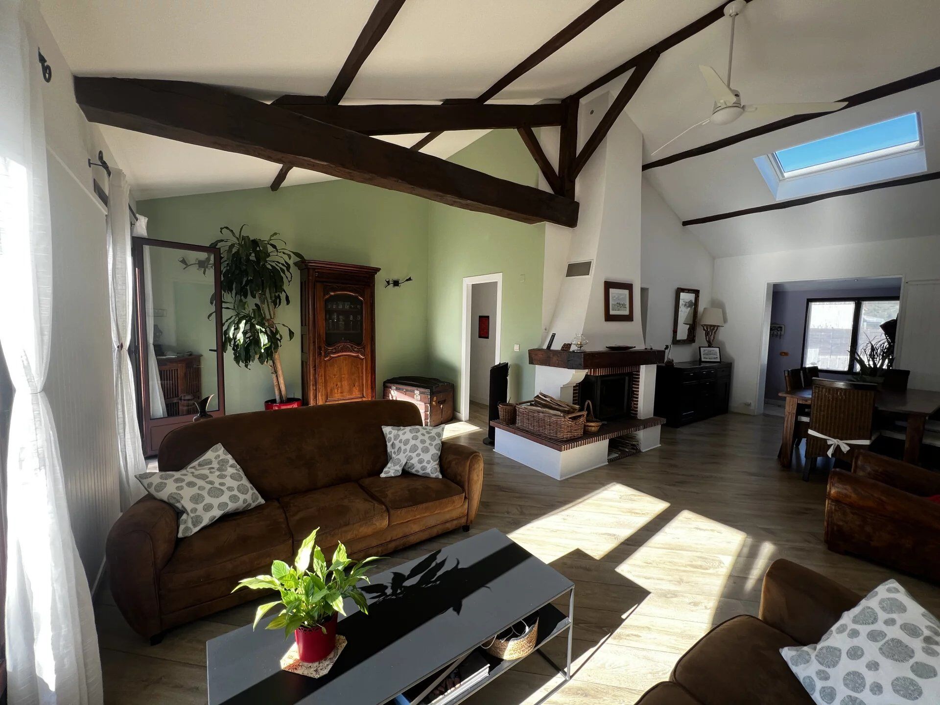 Dès l'entrée, la sensation d'espace sous le plafond cathédrale ne cherche pas à impressionner, mais à faire respirer. La ferme en bois apporte cette chaleur rassurante d'une structure solide, tandis que la lumière, omniprésente, crée un effet cocon immédiat. Ici, le volume sert le calme, pas l'apparat.